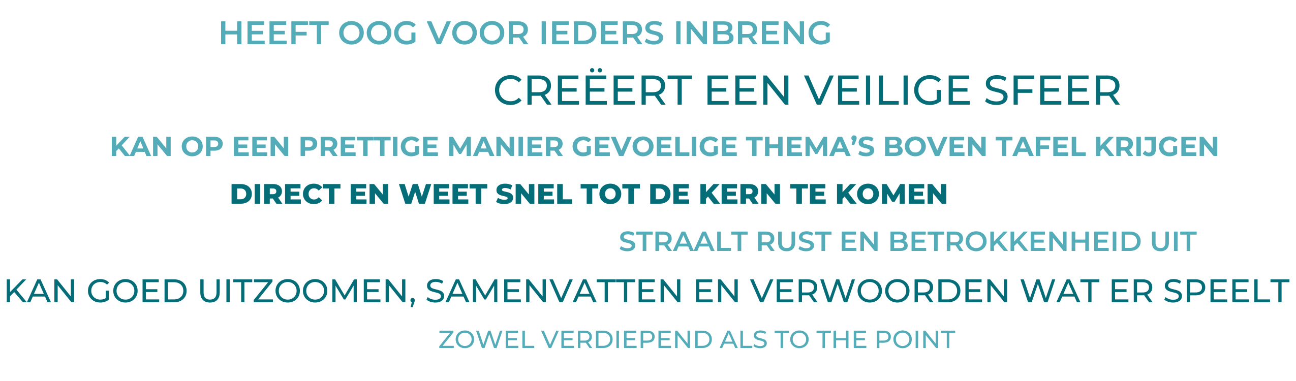 Samen nemen we thema’s onder de loep als onderlinge samenwerking, communicatie, psychologische veiligheid, duurzame inzetbaarheid, besluitvorming onder de loep nemen of werken we aan een toekomstvisie.